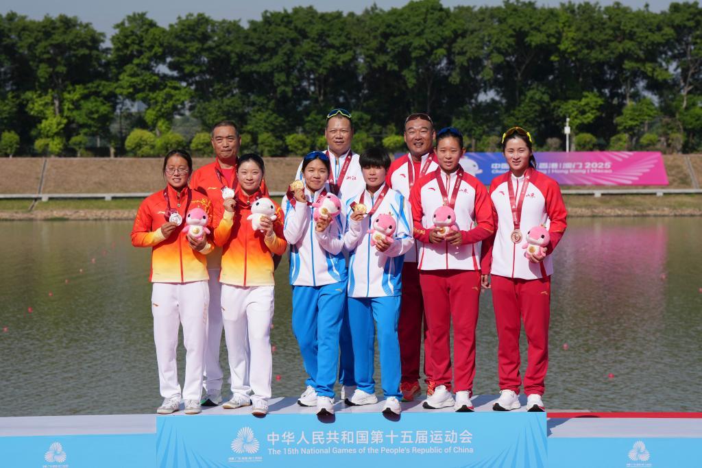 11月17日,冠軍浙江隊組合李舒琪(前排左三)/薛麗娜(前排右三)、亞軍湖北隊組合滕安碩(前排左一)/蔣希娜(前排左二)、季軍山東隊組合孫夢雅(右一)/張雅玨(右二)在頒獎儀式上與她們的教練員合影。當(dāng)日,第十五屆全國運動會皮劃艇靜水項目女子500米雙人劃艇決賽在廣州舉行。新華社記者 晉美多吉 攝