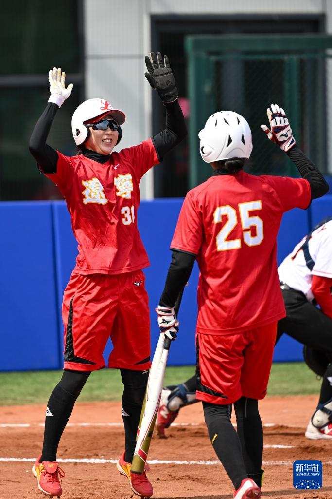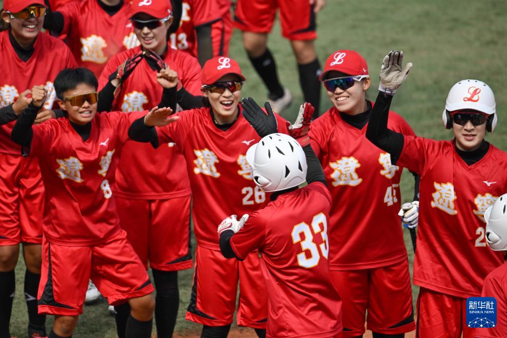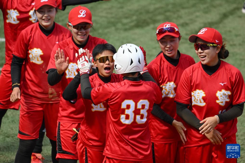 11月17日,遼寧隊(duì)球員楊蕙齊(右)在比賽中打出滿壘全壘打。