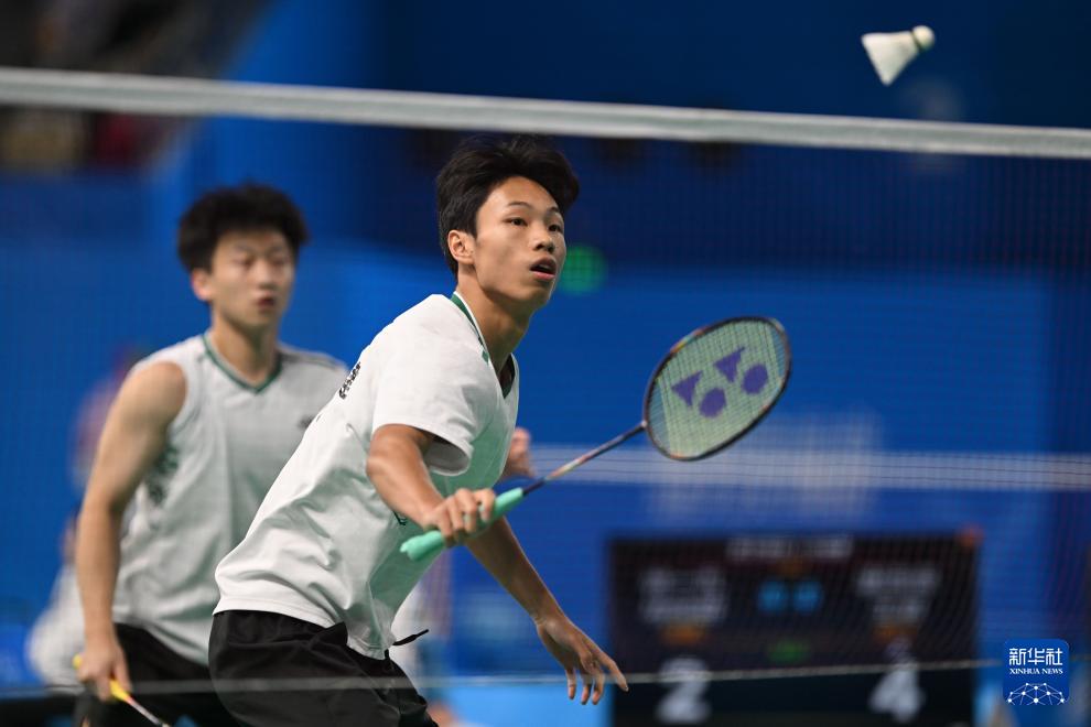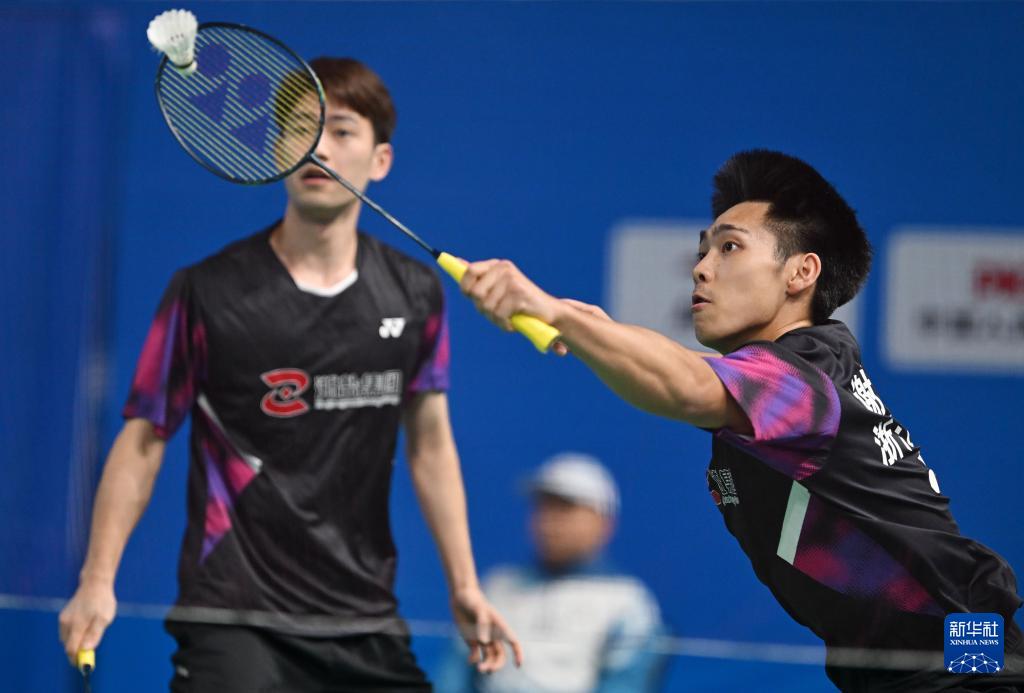 11月17日,浙江隊組合謝浩南/王昶(左)在比賽中。他們2比0戰(zhàn)勝福建隊組合林一凡/楊佳嶧,晉級半決賽。