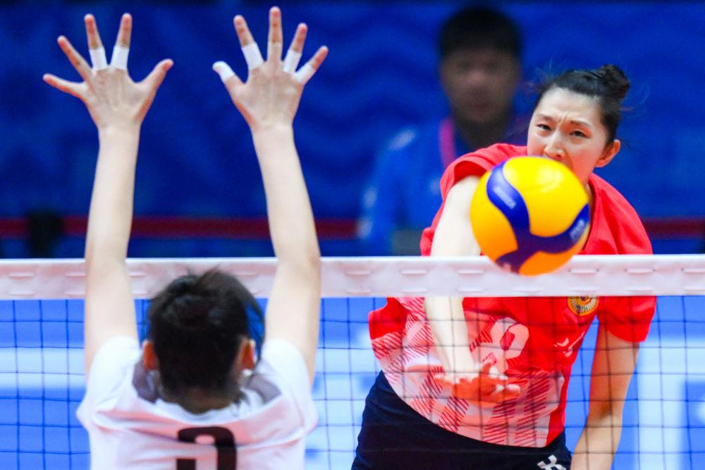 11月17日,江蘇隊球員吳夢潔(右)在比賽中進攻。新華社發(fā)(張金加攝)