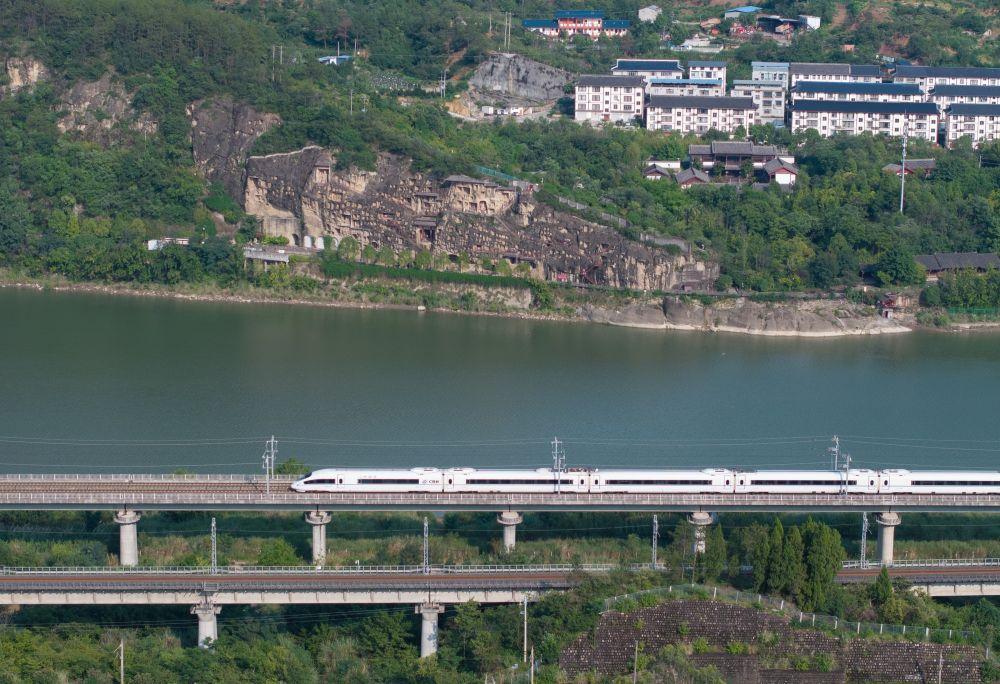 2025年7月18日,在四川省廣元市千佛崖景區(qū)對(duì)面的嘉陵江畔,一列高鐵列車運(yùn)行在西成高鐵上(無(wú)人機(jī)照片)。千佛崖腳下的金牛古蜀道和對(duì)岸的高鐵列車,濃縮成一幅千年蜀道變遷圖。