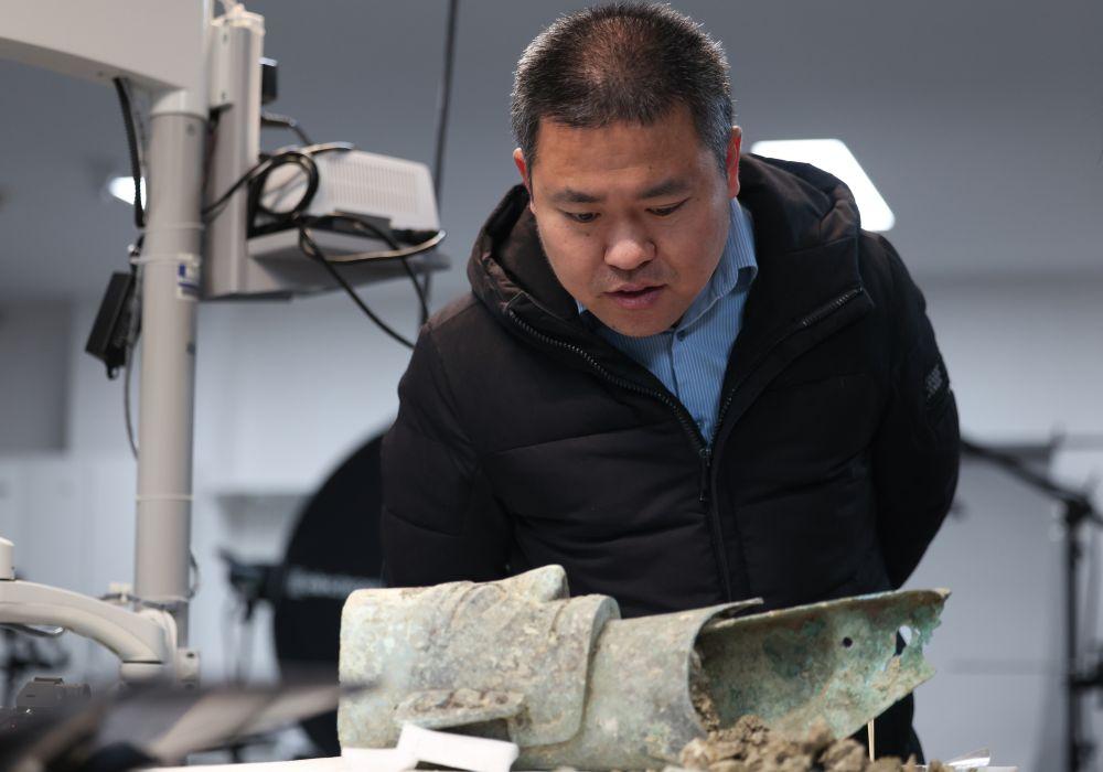 2024年12月16日,考古專家在三星堆研究院仔細(xì)查看一件青銅面具。當(dāng)日,古蜀文明保護(hù)傳承二期工程在三星堆研究院?jiǎn)?dòng)。