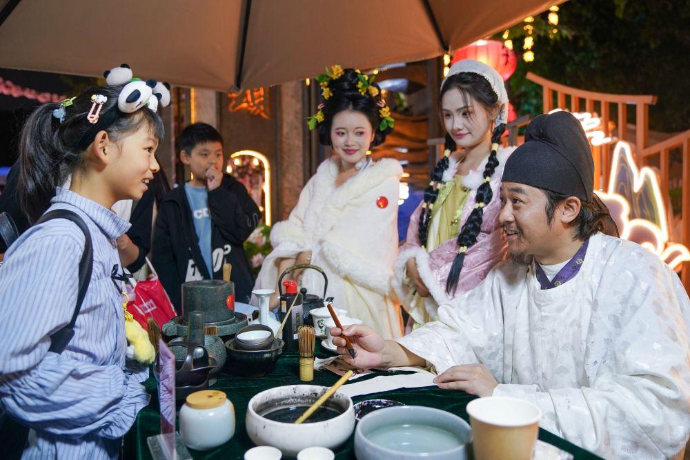 2024年10月4日,在四川省成都市東門(mén)碼頭夜游錦江項(xiàng)目推出的“錦夜慶華誕·璀璨耀蓉城”國(guó)慶系列主題活動(dòng)上,“李白”(右)與小朋友互動(dòng)對(duì)詩(shī)。