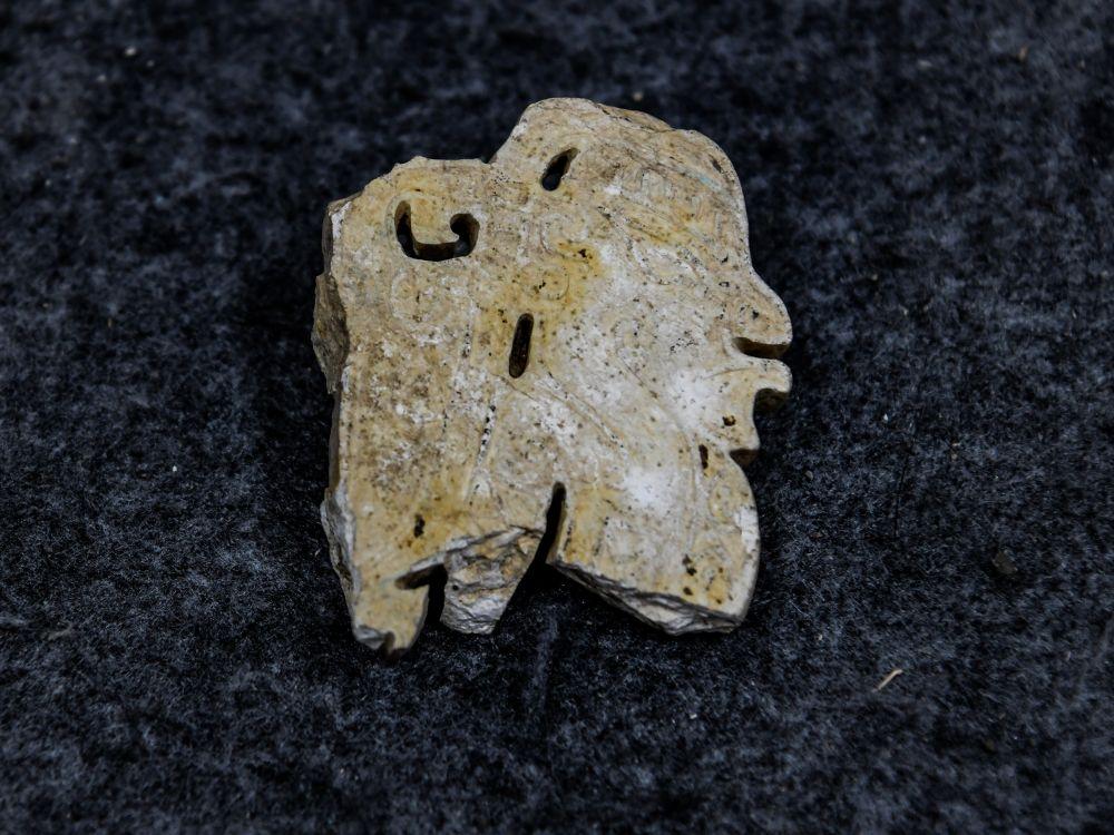 2024年7月10日在四川省文物考古研究院拍攝的三星堆遺址出土的玉石上陽(yáng)刻的側(cè)身人像。三星堆遺址新發(fā)現(xiàn)與玉石器生產(chǎn)加工相關(guān)的遺存,專家初步判斷為玉石器“生產(chǎn)車間”,年代為商代中期,距今約3500年至3400年。