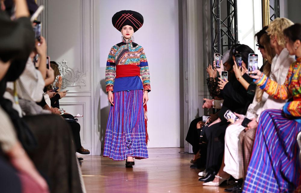 2025年10月1日,在法國(guó)巴黎中國(guó)文化中心舉行的第三屆中法時(shí)裝周上,模特在“非遺四川·百城百藝”鹽邊·傈僳族服飾時(shí)尚秀上展示服裝。