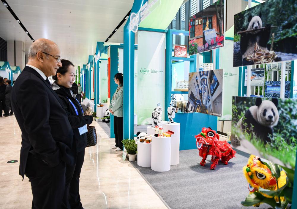 2024年11月26日,參會(huì)嘉賓在2024全球熊貓伙伴大會(huì)間隙觀看舞獅機(jī)器人表演。