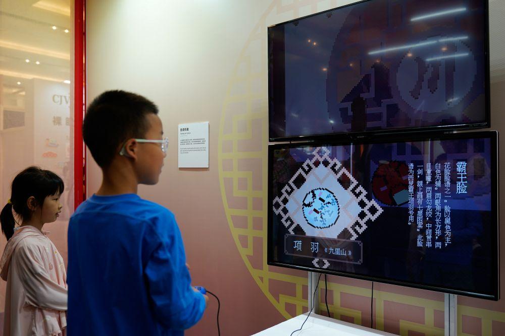 2025年5月31日,在第九屆中國(guó)成都國(guó)際非物質(zhì)文化遺產(chǎn)節(jié)上,小朋友通過(guò)互動(dòng)游戲了解川劇臉譜。