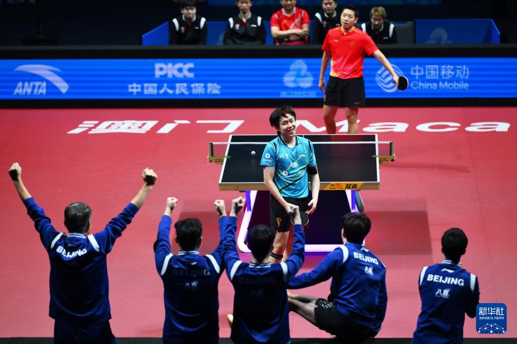 11月20日,北京隊選手王楚欽(中)在贏得男單比賽后。他3比0戰(zhàn)勝上海隊選手許昕。