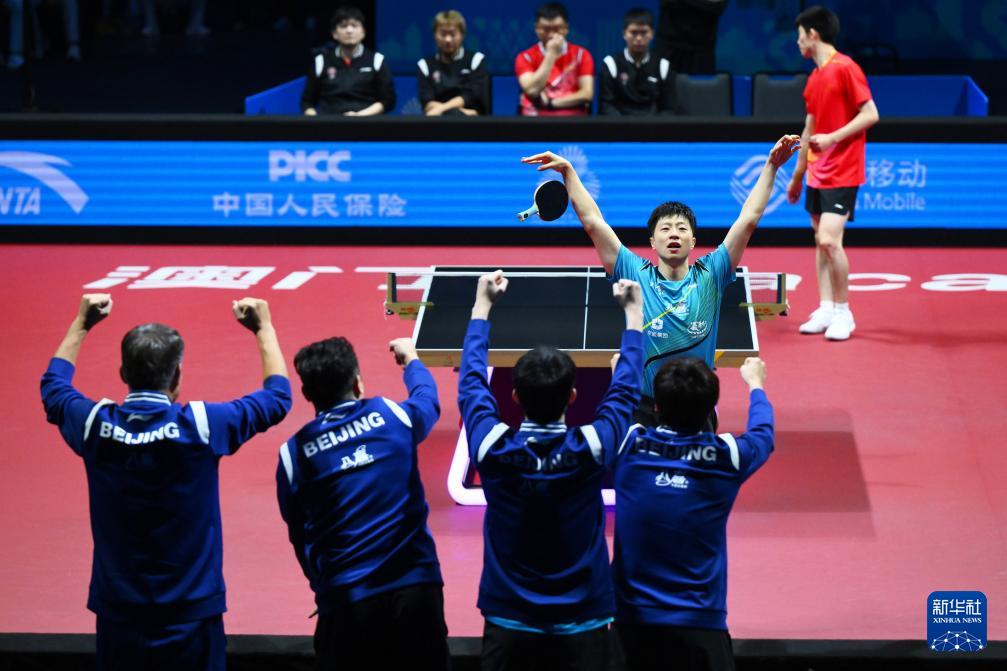11月20日,北京隊選手馬龍(中)慶祝男單比賽獲勝。他3比0戰(zhàn)勝上海隊選手周愷。