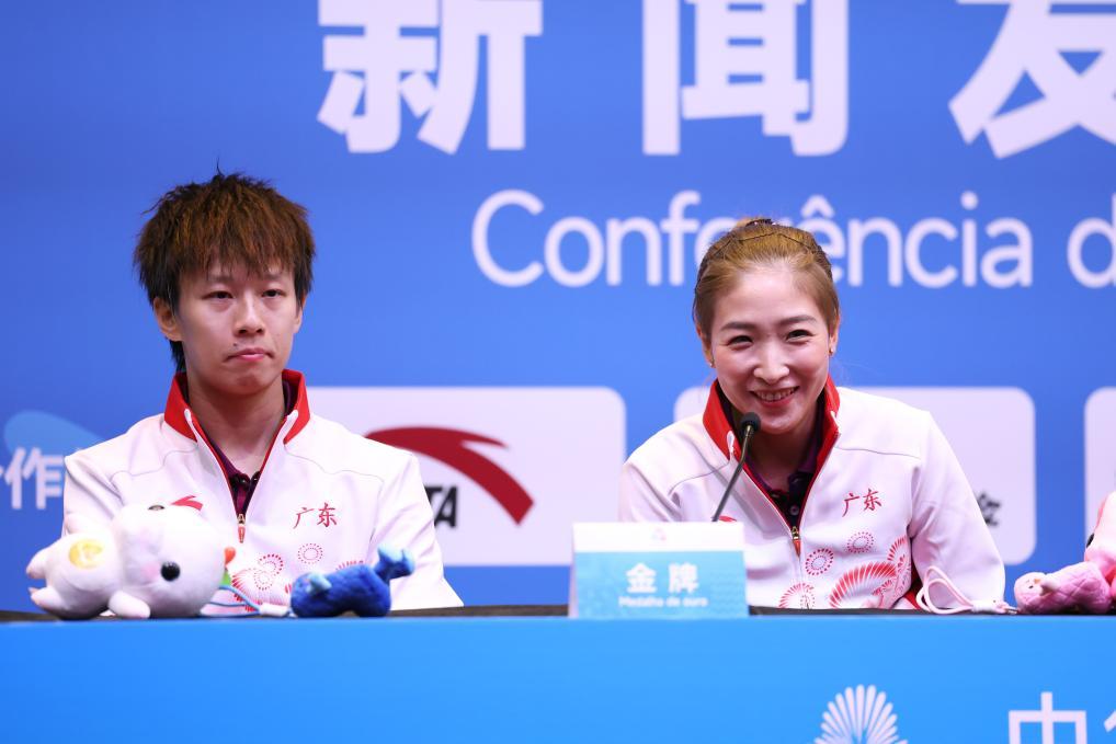11月15日,獲得全運(yùn)會(huì)乒乓球混合雙打冠軍的廣東隊(duì)組合林高遠(yuǎn)(左)/劉詩(shī)雯在賽后新聞發(fā)布會(huì)上接受采訪。新華社記者 梁旭 攝