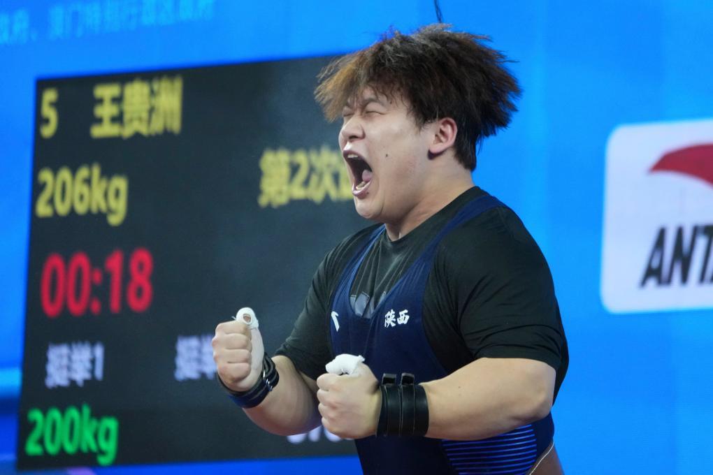 11月20日,陜西隊選手王貴洲在挺舉比賽中試舉成功后慶祝。新華社記者 楊晨光 攝