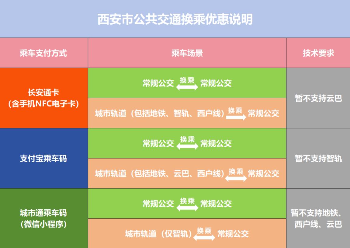 乘客不需要改變原有的支付方式,即可根據(jù)換乘情況選擇相應(yīng)的支付方式實(shí)現(xiàn)優(yōu)惠。有以下幾點(diǎn)需要說明:(1)換乘前后需使用同一種支付方式;(2)長安通卡是指普通成人長安通實(shí)體卡(含NFC電子卡),享受換乘優(yōu)惠政策(學(xué)生卡、老年卡、愛心卡等其他優(yōu)惠卡種已經(jīng)享受更加優(yōu)惠的乘車政策,因此不再參與換乘優(yōu)惠);(3)符合條件的二維碼是指可同時(shí)支持西安市常規(guī)公交與城市軌道出行且參與換乘優(yōu)惠政策的App或小程序(例如支付寶、微信等),根據(jù)符合條件情況,將適時(shí)動態(tài)調(diào)整。