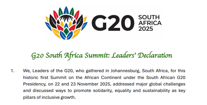二十國集團(tuán)(G20)領(lǐng)導(dǎo)人第二十次峰會(huì)當(dāng)?shù)貢r(shí)間11月22日在南非約翰內(nèi)斯堡開幕。南非國際關(guān)系與合作部長羅納德?拉莫拉在當(dāng)天下午召開的記者發(fā)布會(huì)上表示,與會(huì)各方已就會(huì)議核心議程達(dá)成共識(shí),并通過了《二十國集團(tuán)領(lǐng)導(dǎo)人約翰內(nèi)斯堡峰會(huì)宣言》。