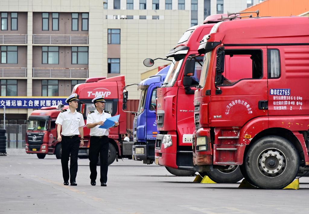 2025年8月27日,海關(guān)關(guān)員在中國傳化(上合)國際物流港內(nèi)監(jiān)管貨車發(fā)運(yùn)。新華社記者 李紫恒 攝