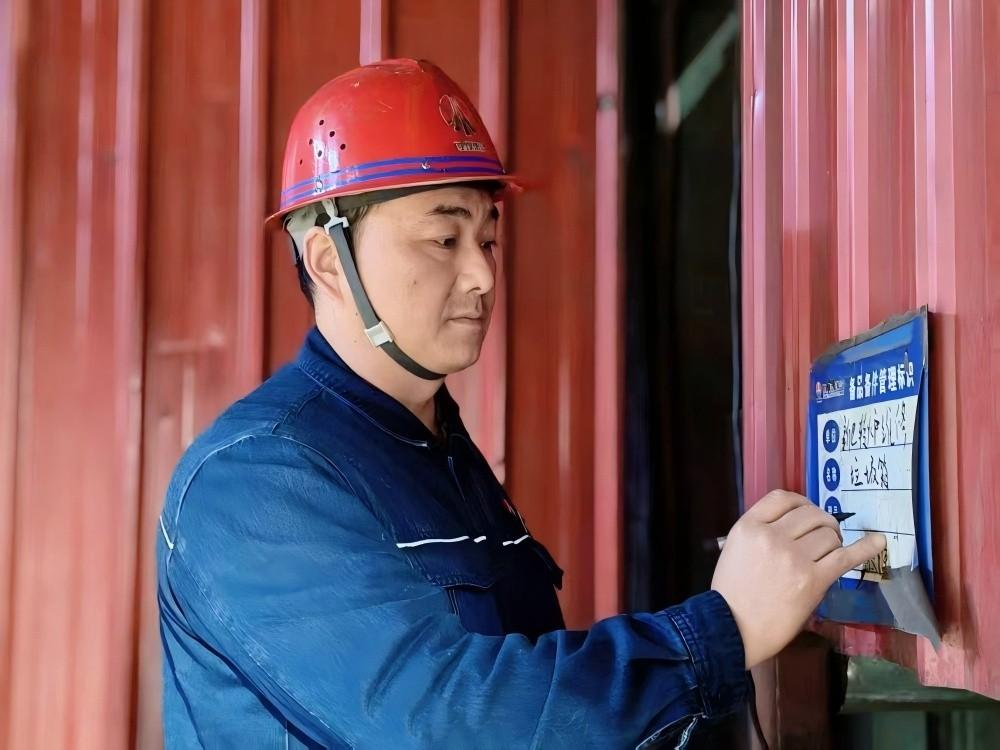 圖二:轉(zhuǎn)爐維修段長(zhǎng)孫飛對(duì)設(shè)備運(yùn)轉(zhuǎn)情況進(jìn)行確認(rèn)簽字