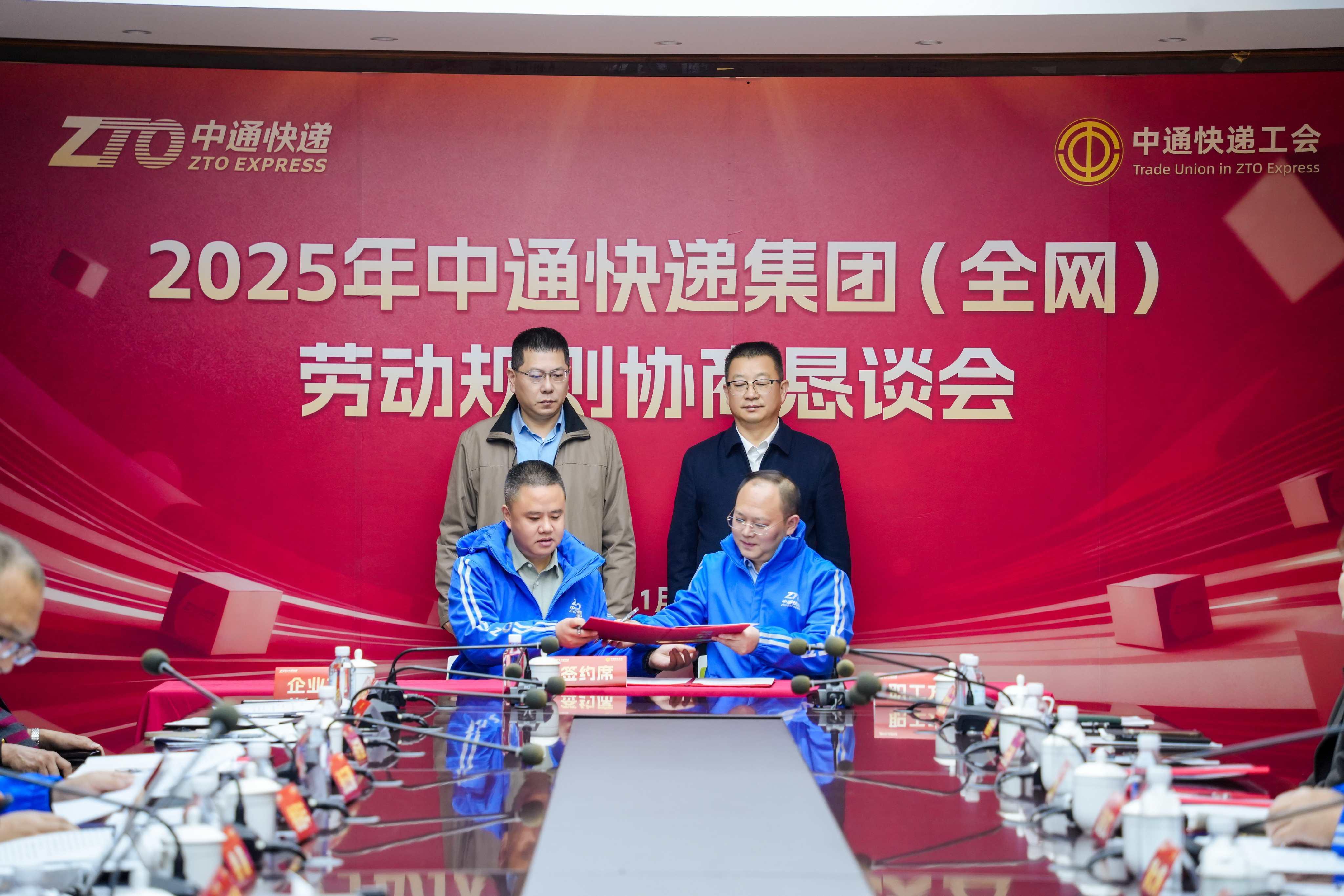 會議期間,上級工會為一線快遞員代表發(fā)放慰問禮包,傳遞工會組織的暖心關懷。隨后,職工方與企業(yè)方共同簽署《2025年中通快遞集團(全網)勞動規(guī)則協(xié)議(草案)》,上海市總工會、青浦區(qū)總工會領導共同見證。