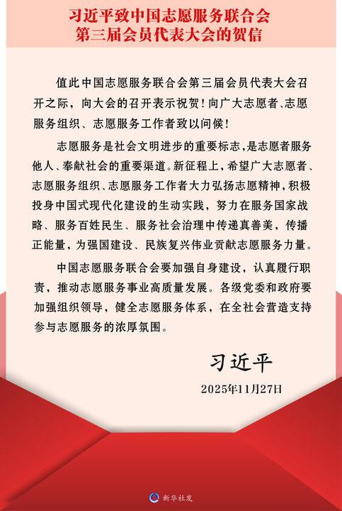 中國志愿服務(wù)聯(lián)合會第三屆會員代表大會27日至28日在京召開,會上宣讀了習(xí)近平的賀信。