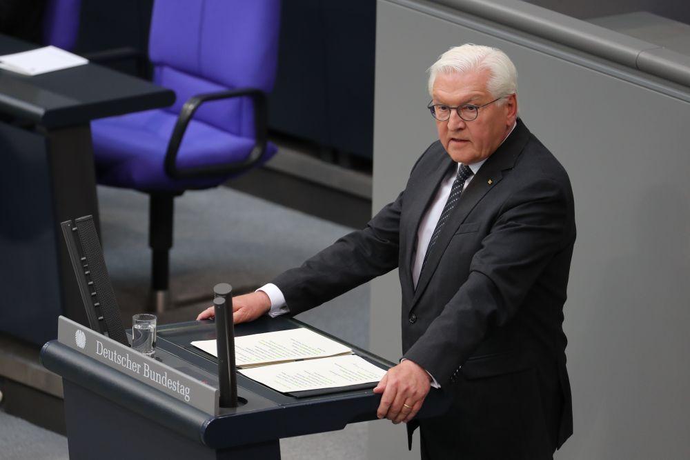 5月8日,德國(guó)總統(tǒng)施泰因邁爾在首都柏林國(guó)會(huì)大廈舉行的第二次世界大戰(zhàn)歐洲戰(zhàn)場(chǎng)勝利80周年紀(jì)念活動(dòng)上致辭。新華社記者杜哲宇攝