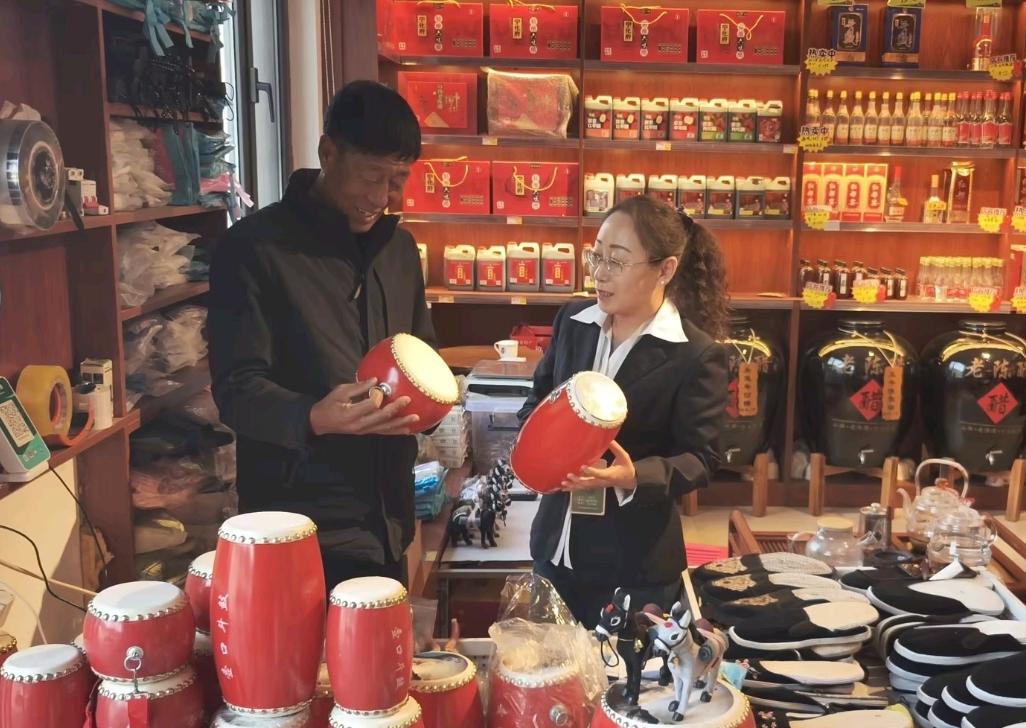 在悉心指導(dǎo)下,張軍紅聯(lián)合本地商戶開(kāi)發(fā)了“宜川紅色胸鼓”文創(chuàng)產(chǎn)品,將革命圣地延安的紅色文化與壺口瀑布的地域特色結(jié)合,設(shè)計(jì)出兼具實(shí)用性與紀(jì)念性的伴手禮。同時(shí),他重新規(guī)劃店鋪布局,增設(shè)“地方特產(chǎn)”展示區(qū),用亮眼的陳列吸引游客駐足。如今,游客一進(jìn)店,張軍紅便熱情介紹:“這胸鼓刻著壺口瀑布圖案,配上延安的紅色故事,帶回去既是實(shí)用品,更是文化記憶!”