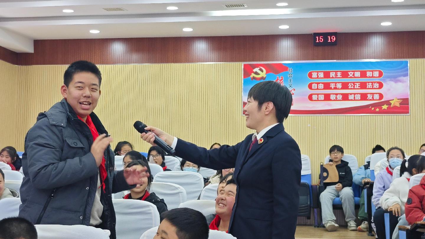 任兆錦通過一個個貼近校園生活的案例和提問,將憲法條文與學(xué)生的日常生活緊密相連,激發(fā)同學(xué)們積極思考。她還結(jié)合“驪雨新荷”工作室辦理的真實案例,深入淺出地講解了網(wǎng)絡(luò)安全、防范欺凌、自我保護(hù)等與未成年人密切相關(guān)的法律知識,強(qiáng)調(diào)憲法是保護(hù)青少年健康成長最堅實的盾牌。