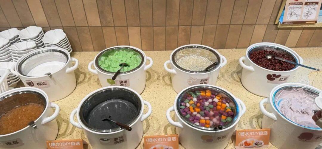 之后是類似優(yōu)優(yōu)烤板栗、高山烤蜜薯、潮汕甜湯、半熟芝士等流行甜點(diǎn)和小吃的設(shè)置,也能增加產(chǎn)品的豐富度。以潮汕甜湯為例,總共有椰奶、抹茶布丁、芋泥8個(gè)品種,顧客可自行DIY。