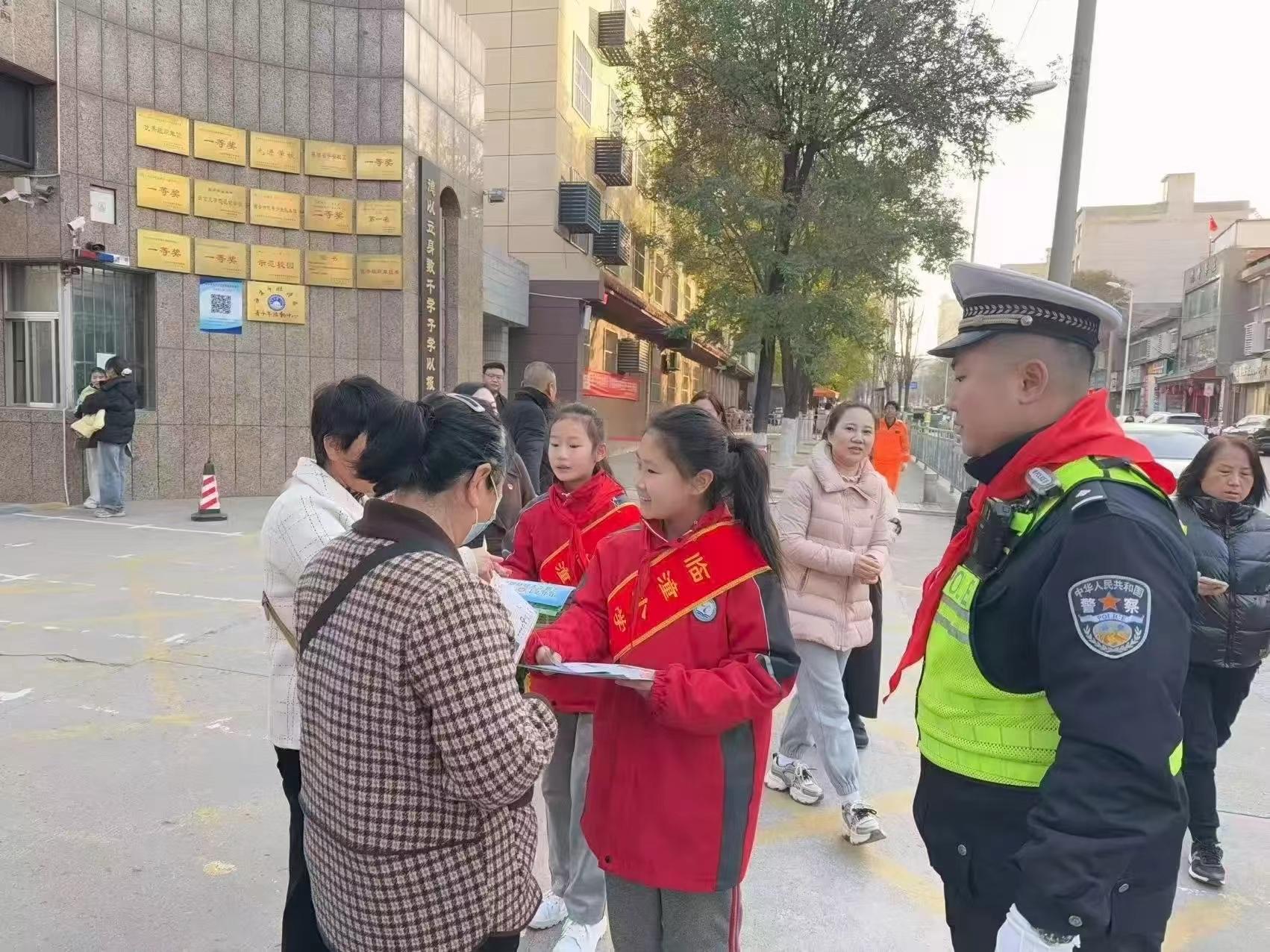 在實踐環(huán)節(jié)中,民警帶領(lǐng)30名“小小交通安全宣傳員”,手持印有交通安全標語的宣傳彩頁,在學校周邊路口開展實踐宣傳。