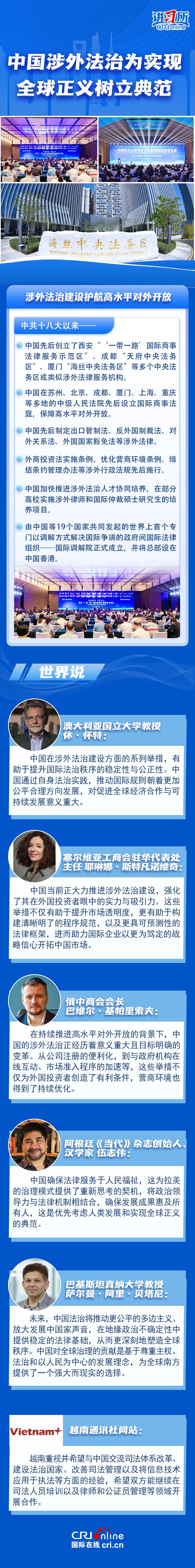 今年10月,中共二十屆四中全會(huì)審議通過的“十五五”規(guī)劃建議提出,要加快涉外法治體系和能力建設(shè),健全國(guó)際商事調(diào)解、仲裁、訴訟等機(jī)制,并將“社會(huì)主義法治國(guó)家建設(shè)達(dá)到更高水平”列入中國(guó)未來五年經(jīng)濟(jì)社會(huì)發(fā)展的主要目標(biāo)之一。國(guó)際社會(huì)認(rèn)為,中國(guó)在涉外法治建設(shè)方面的系列舉措,確保發(fā)展成果惠及所有人,為實(shí)現(xiàn)全球正義樹立了典范,有助于提升國(guó)際法治秩序的穩(wěn)定性與公正性,推動(dòng)國(guó)際規(guī)則朝著更加公平合理方向發(fā)展。
