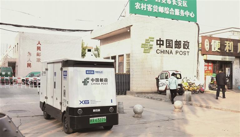 12月4日,陜西郵政無人投遞車從西安市長安區(qū)農(nóng)村客貨郵綜合服務(wù)中心駛出,前往各投遞點(diǎn)。