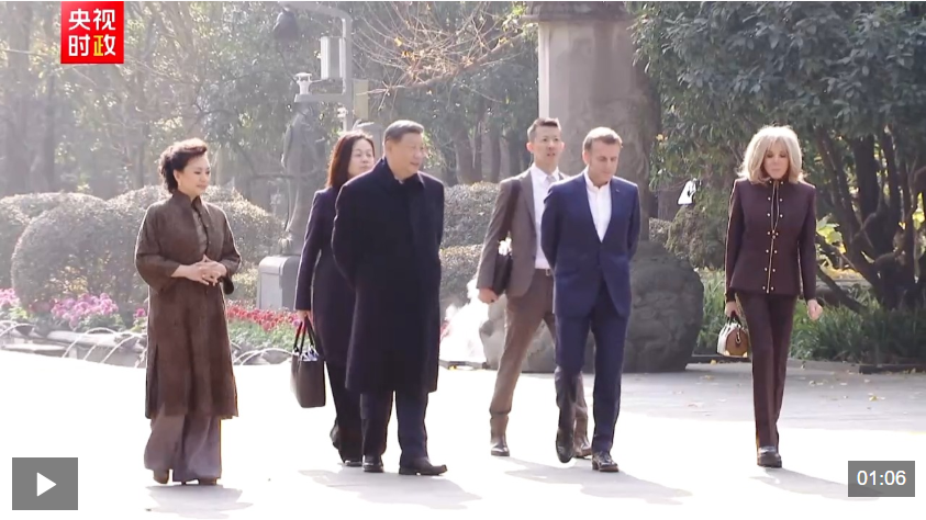 初冬的都江堰,蒼山掩翠。馬克龍夫婦抵達(dá)時(shí),受到習(xí)近平和彭麗媛熱情迎接。兩國(guó)元首夫婦沿堰功道邊走邊談。習(xí)近平介紹都江堰歷史和意義,指出都江堰水利工程是全世界迄今唯一仍在使用的古代水利工程,也是人類與自然和諧共生最早的成功實(shí)踐之一,修建過(guò)程充分反映了中華民族自強(qiáng)不息、不畏艱難、勇于開(kāi)拓的精神。兩國(guó)元首夫婦落座懷古亭,臨水品茗,縱論天下。
