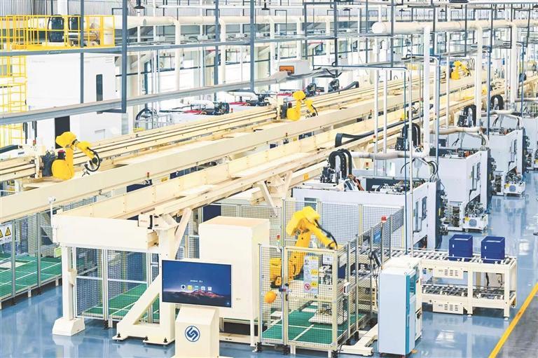 “從原料拿取、上線生產(chǎn)到成品入庫(kù),多臺(tái)工業(yè)機(jī)器人和智能自動(dòng)引導(dǎo)小車等自動(dòng)化設(shè)備可精準(zhǔn)配合智能化數(shù)控機(jī)床高效作業(yè),整個(gè)過程無(wú)需人力干預(yù)、輔助,全程實(shí)現(xiàn)智能化生產(chǎn)。”該公司總經(jīng)理助理劉春說,目前,車間整體自動(dòng)化率超過95%。