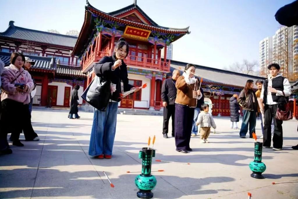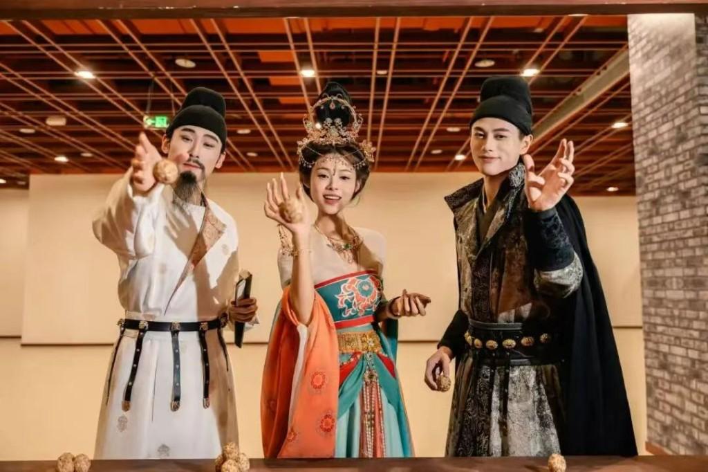 活動中,媒體們乘坐全國首輛唐詩主題觀光車“長安尋夢”穿梭于城市地標(biāo)之間。車廂內(nèi)點(diǎn)綴著滿滿的唐詩元素裝飾,氛圍感十足,更有“李白”“楊貴妃”全程相伴講解,以全新的情景互動方式講述“唐朝、長安、名士”的傳奇故事。大唐西市博物館內(nèi),“五陵年少金市東”的詩句與絲路貿(mào)易文物相映,讓“胡商云集”的場景鮮活再現(xiàn);興慶宮公園沉香亭前,牡丹綻放,李白為楊貴妃作《清平調(diào)》的典故引人入勝,投壺互動復(fù)刻“流觴”雅趣;長安十二時辰街區(qū)里,《長安古意》中的市井盛景被實(shí)景復(fù)原,NPC詩詞對話讓傳統(tǒng)文化可觸可及。