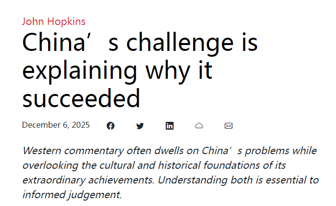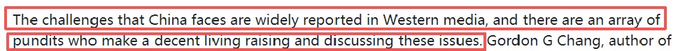 文章認(rèn)為,西方媒體對(duì)中國的問題報(bào)道頗多,甚至許多專家靠分析和討論這些問題謀生。而中國面臨的挑戰(zhàn)是:中國如何讓世界理解過去50年取得的非凡成功?