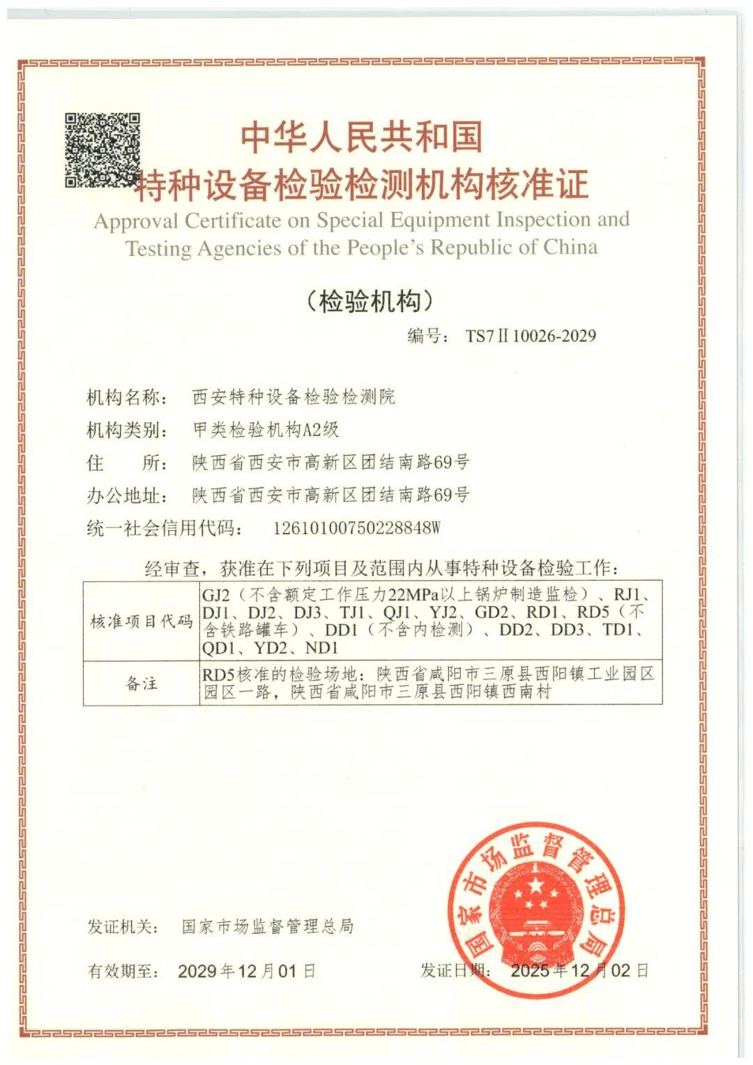 資質(zhì)再升級(jí)!西安特檢院獲國(guó)家級(jí)“甲類A2級(jí)”資質(zhì)認(rèn)證