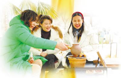 河南欒川縣,游客在畔山民宿圍爐煮茶。