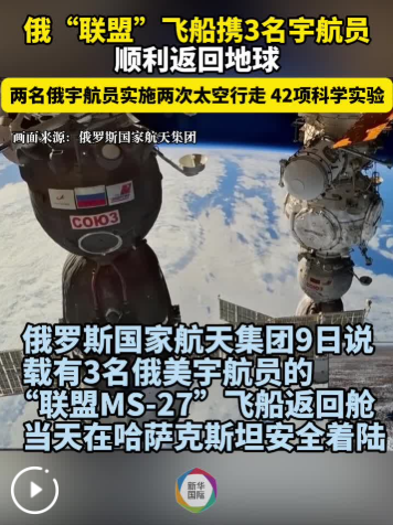 據(jù)俄羅斯國家航天集團9日發(fā)布的消息,載有3名俄美宇航員的“聯(lián)盟MS-27”飛船返回艙當天在哈薩克斯坦安全著陸,他們順利結(jié)束為期8個月的太空之旅。