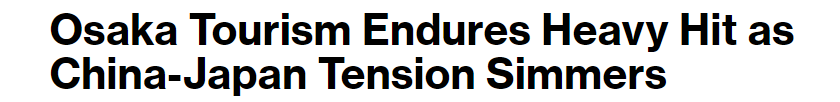 文章說(shuō),大阪是日本第二大經(jīng)濟(jì)中心,其經(jīng)濟(jì)活力與旅游業(yè)緊密相連,尤其在過(guò)去幾年里,中國(guó)游客是推動(dòng)當(dāng)?shù)芈糜蜗M(fèi)的重要力量。但如今這個(gè)城市正承受著中國(guó)游客減少帶來(lái)的巨大沖擊:大阪關(guān)西國(guó)際機(jī)場(chǎng)的航班削減幅度在日本全國(guó)最為顯著,當(dāng)?shù)鼐频?、零售商和餐館也面臨著大面積的訂單取消。