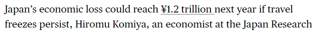 文章援引日本綜合研究所經(jīng)濟(jì)學(xué)家小宮弘(Hiromu Komiya)的話表示,隨著中國(guó)農(nóng)歷新年臨近,預(yù)計(jì)日本的溫泉、滑雪勝地等冬季熱門旅游項(xiàng)目可能會(huì)遭冷遇。如果這種情況持續(xù)下去,日本2026年的經(jīng)濟(jì)損失可能達(dá)到1.2萬(wàn)億日元(約合541億元人民幣)。
