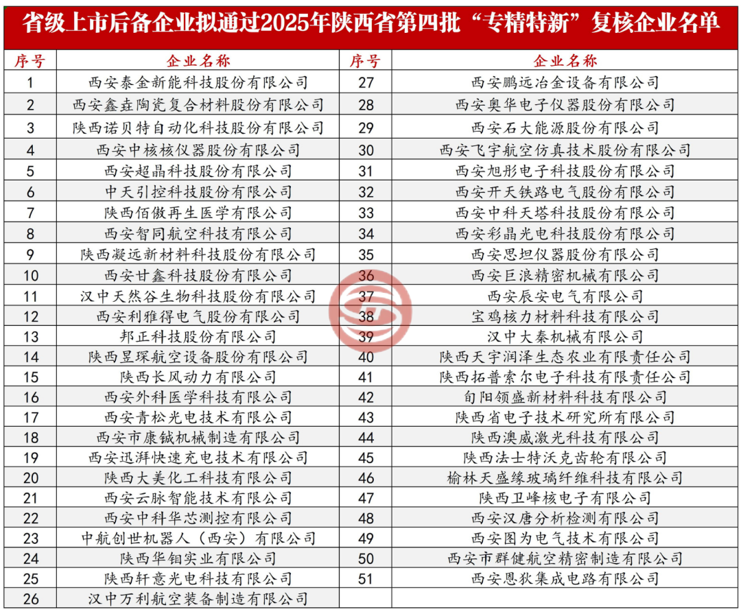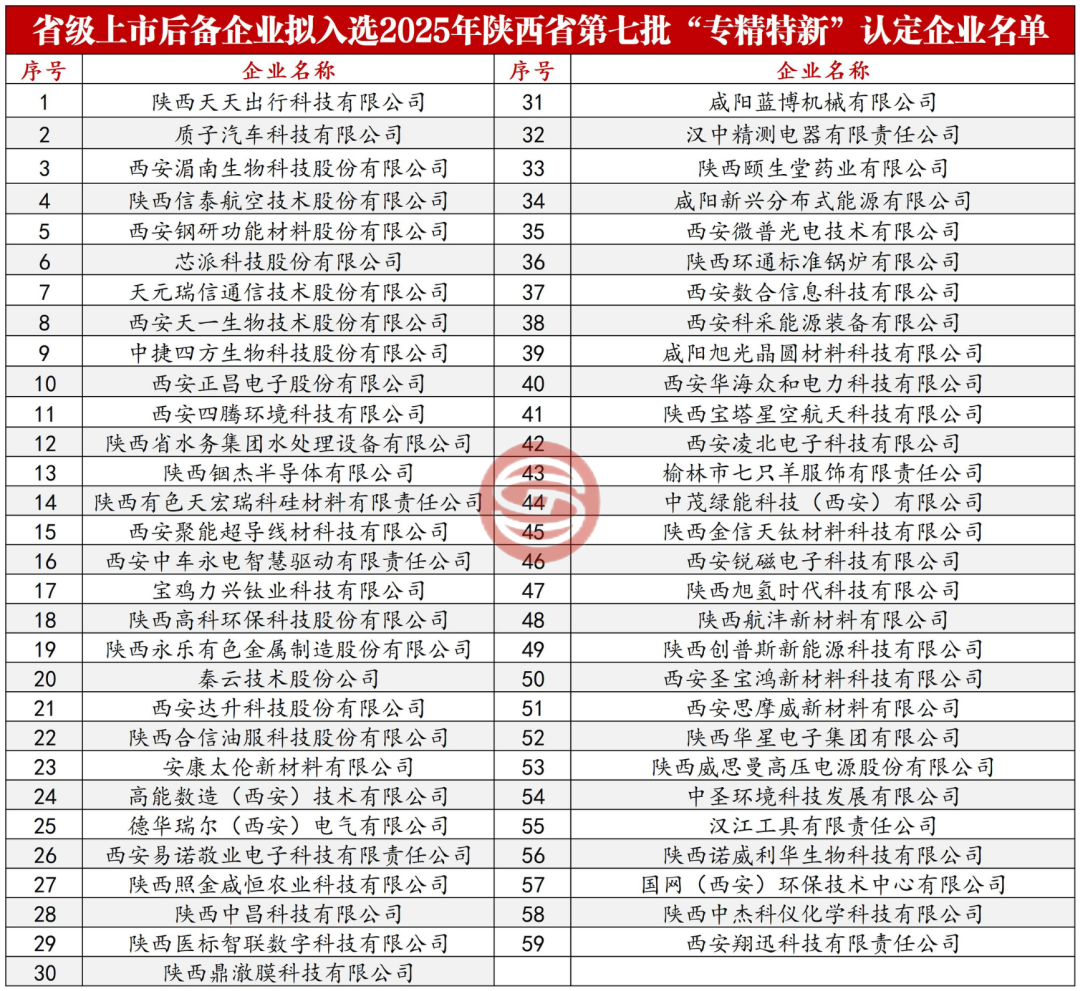 三秦都市報(bào)-三秦網(wǎng)訊(記者 任榮)近日,根據(jù)《陜西省工業(yè)和信息化廳 陜西省財(cái)政廳關(guān)于組織開展2025年陜西省專精特新中小企業(yè)申報(bào)和復(fù)核工作的通知》(陜工信發(fā)〔2025〕151號(hào))要求,經(jīng)過企業(yè)自愿申報(bào)、各市(區(qū))審核推薦、專家評(píng)審等程序,2025年陜西省專精特新中小企業(yè)擬認(rèn)定和擬復(fù)核通過企業(yè)名單正式公示。其中,59家省級(jí)上市后備企業(yè)入選第七批省級(jí)專精特新中小企業(yè)擬認(rèn)定名單,51家省級(jí)上市后備企業(yè)順利通過第四批復(fù)核。