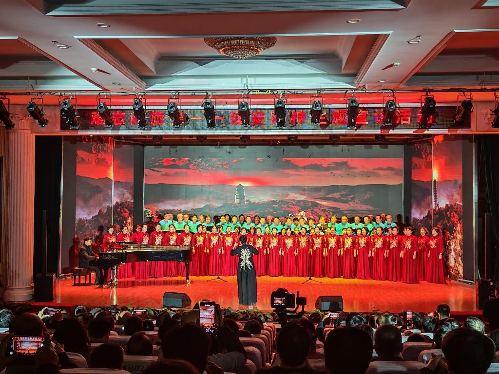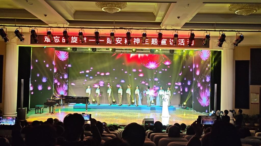 宣講活動在西安星海合唱團(tuán)《延安頌》的歌聲中啟幕?!跋﹃栒找筋^的塔影,月色映照著河邊的流螢,春風(fēng)吹遍了平坦的原野,群山結(jié)成了堅(jiān)固的圍屏……”當(dāng)恢宏豪邁的歌聲響起,昔日延安熱血澎湃欣欣向榮的艱苦奮斗場景仿佛就在眼前。