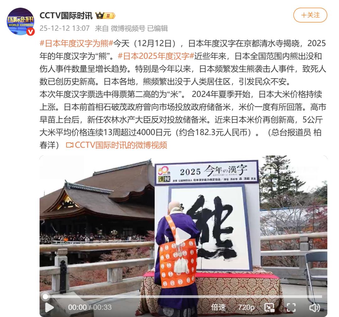 12月12日,日本年度漢字在京都清水寺揭曉,2025年的年度漢字為“熊”。
