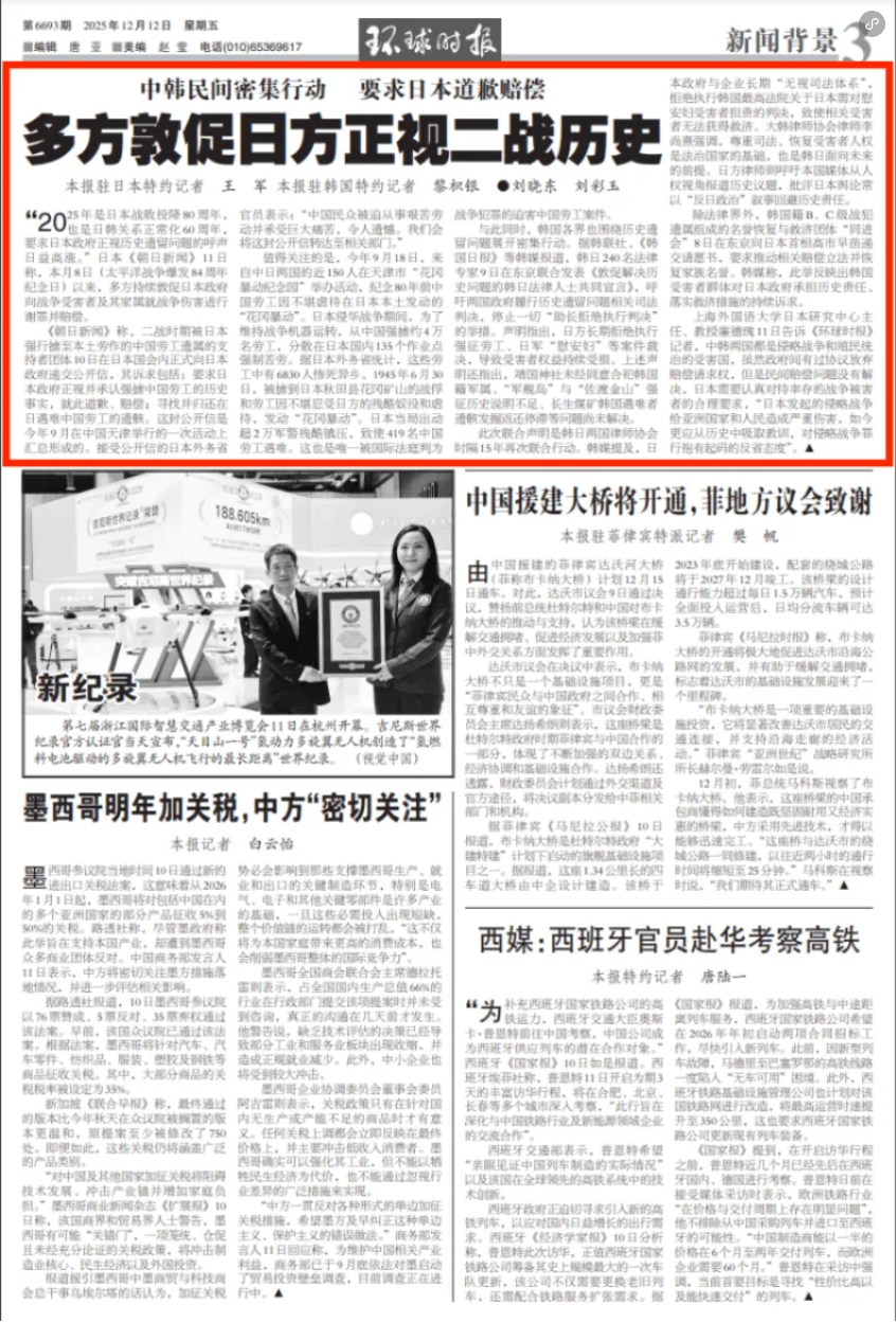與此同時,韓國各界也圍繞歷史遺留問題展開密集行動。據(jù)韓聯(lián)社、《韓國日報》等韓媒報道,韓日240名法律專家9日在東京聯(lián)合發(fā)表《敦促解決歷史問題的韓日法律人士共同宣言》,呼吁兩國政府履行歷史遺留問題相關(guān)司法判決,停止一切“助長拒絕執(zhí)行判決”的舉措。聲明指出,日方長期拒絕執(zhí)行強征勞工、日軍“慰安婦”等案件裁決,導(dǎo)致受害者權(quán)益持續(xù)受損。上述聲明還指出,靖國神社未經(jīng)同意合祀韓國籍軍屬、“軍艦島”與“佐渡金山”強征歷史說明不足、長生煤礦韓國遇難者遺骸發(fā)掘返還停滯等問題尚未解決。