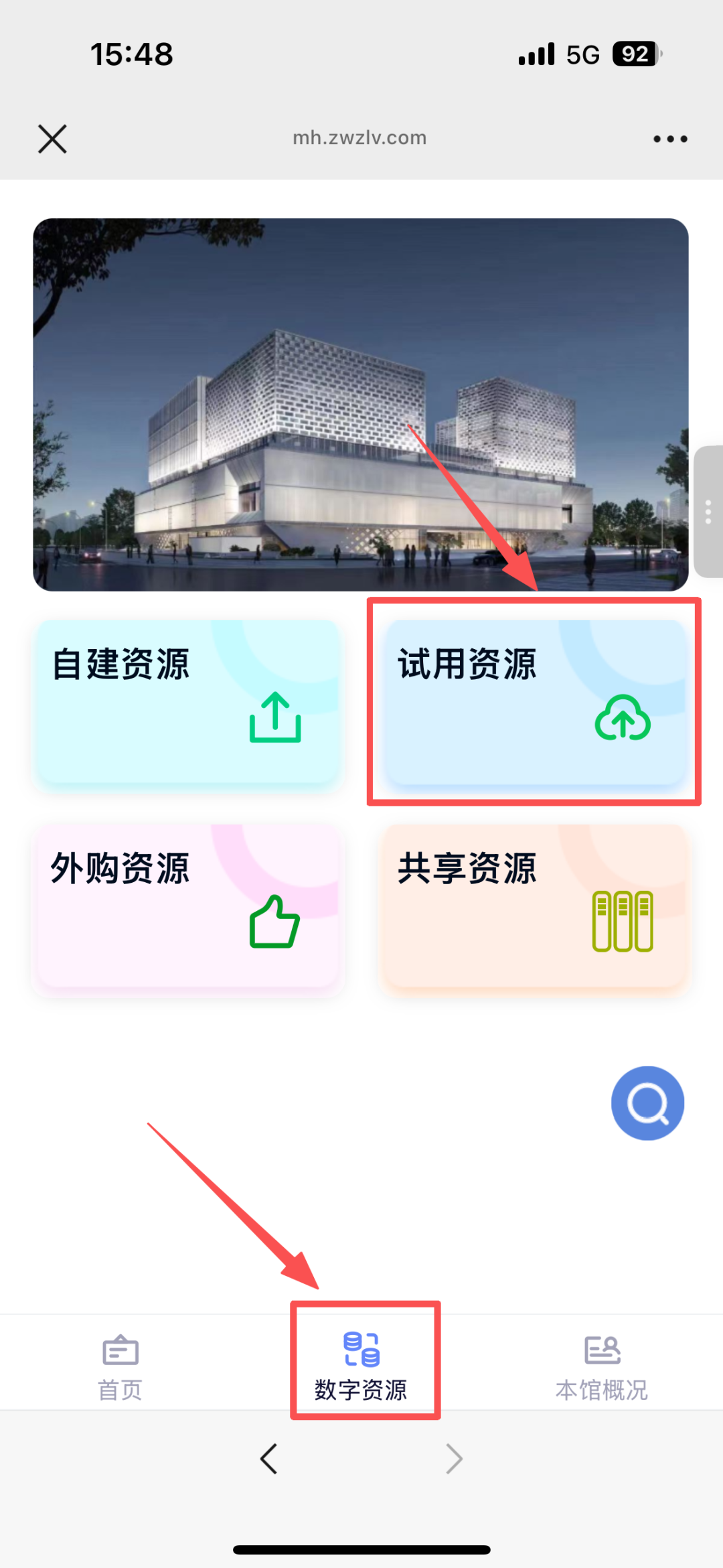 第二步:點(diǎn)擊數(shù)字資源-試用資源