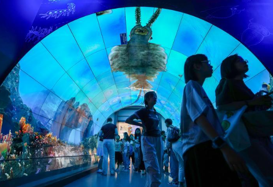 2025年7月15日,游客在玉溪市澄江化石地世界自然遺產(chǎn)博物館“寒武紀海底隧道”參觀。