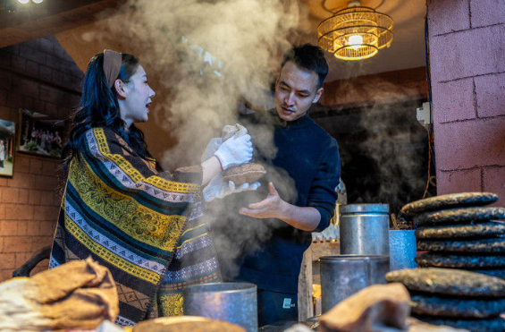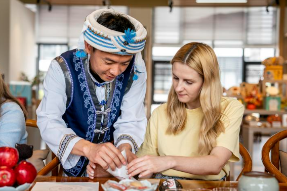 2024年4月13日,一名俄羅斯塔斯社記者(右)在大理市體驗包裝下關(guān)沱茶。據(jù)統(tǒng)計,2025年1月至6月,云南省接待入境過夜游客251.03萬人次,同比增長86%。