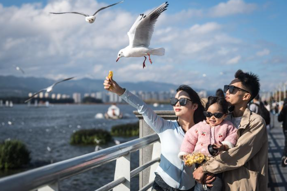 2025年11月10日,游客在昆明市海埂大壩投喂紅嘴鷗。