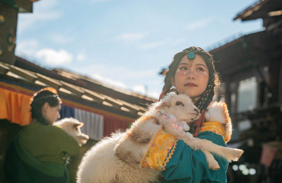 2023年3月8日,游客在迪慶州香格里拉市獨克宗古城拍照留念。