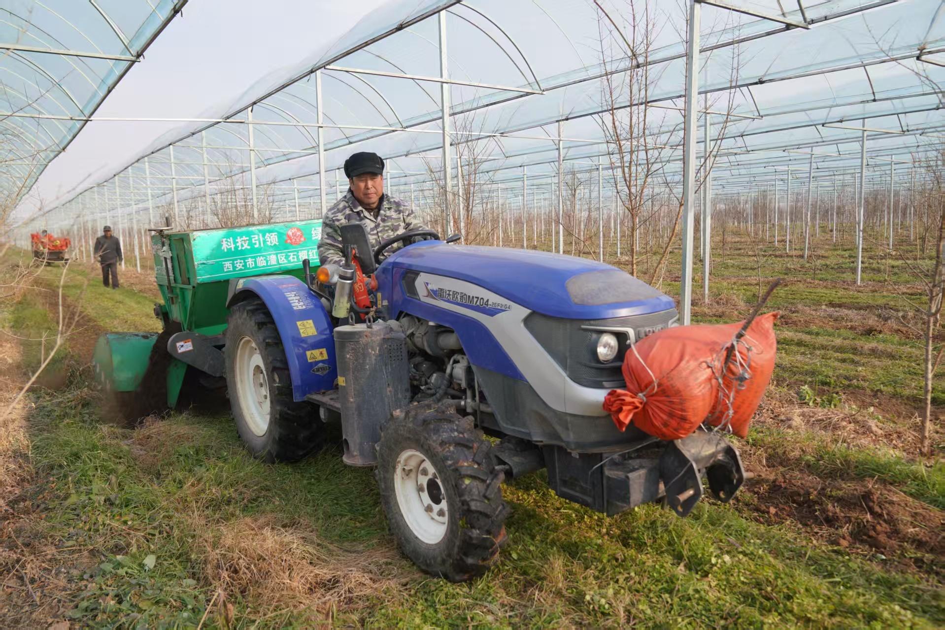 不遠(yuǎn)處,伴隨著機(jī)械的轟鳴聲,工人雷增放駕駛著施肥機(jī)在石榴樹行間靈活穿梭。開溝、施肥、覆土,一系列動(dòng)作一氣呵成,短短幾分鐘,就完成了數(shù)十棵樹的施肥任務(wù)。