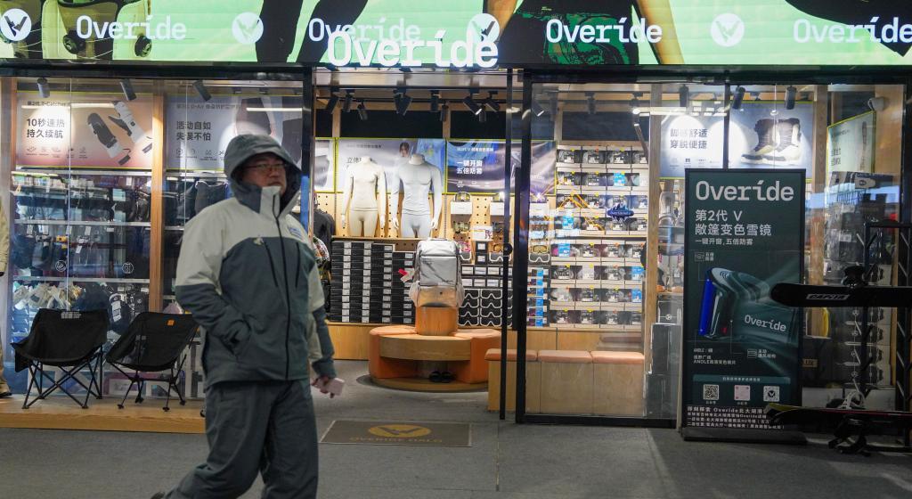 12月2日,在吉林市北大湖滑雪度假區(qū),游客經過一家國產品牌雪具店。(新華社記者 顏麟蘊 攝)