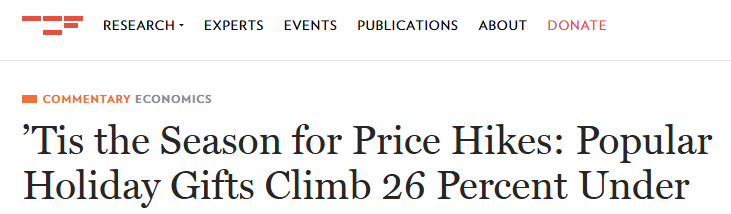 根據(jù)無(wú)黨派智庫(kù)世紀(jì)基金會(huì)(The Century foundation)、基石合作組織(Groundwork Collaborative)與美國(guó)教師聯(lián)合會(huì)(AFT)的最新聯(lián)合分析,這個(gè)假日季美國(guó)許多熱門(mén)節(jié)日禮物的價(jià)格大幅上漲,平均漲幅達(dá)26%,接近美國(guó)當(dāng)前整體通脹率的九倍。無(wú)論顧客在哪個(gè)貨架間穿梭,都會(huì)發(fā)現(xiàn)價(jià)格普遍上漲:家居用品和廚房用品的價(jià)格上漲了38%,電子產(chǎn)品上漲了34%,服裝、鞋類(lèi)和配飾上漲了20%,玩具和游戲上漲了17%。