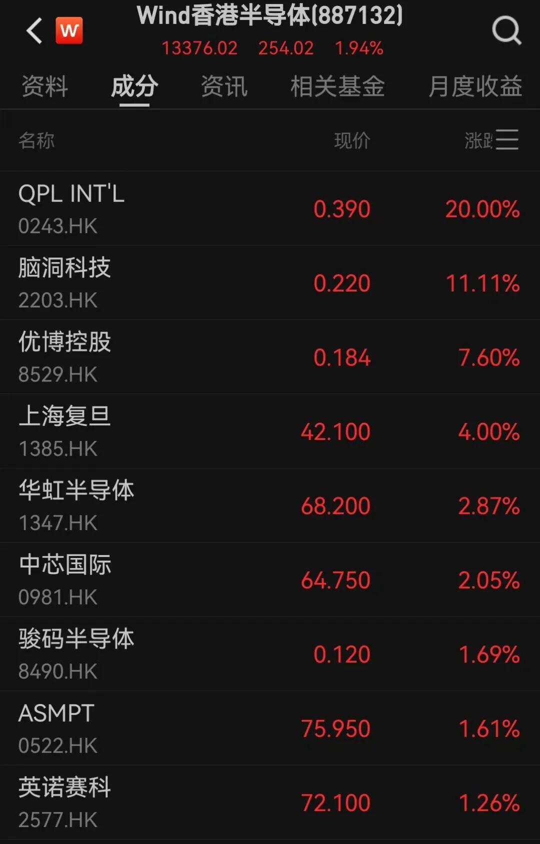 半導(dǎo)體板塊大漲,腦洞科技漲超11%,上海復(fù)旦漲4%,華虹半導(dǎo)體漲近3%,中芯國際漲超2%。